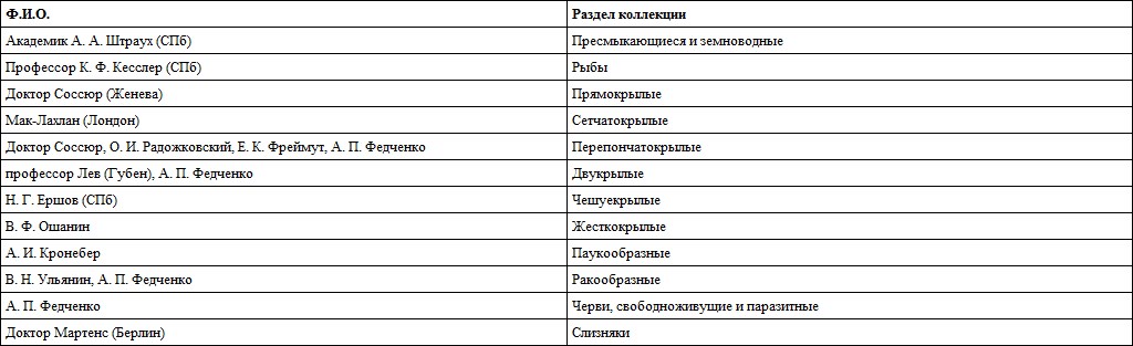Таблица 4. Зоологи, принимавшие участие в разборе туркестанских коллекций А. П. и О. А. Федченко (1872 г.)
