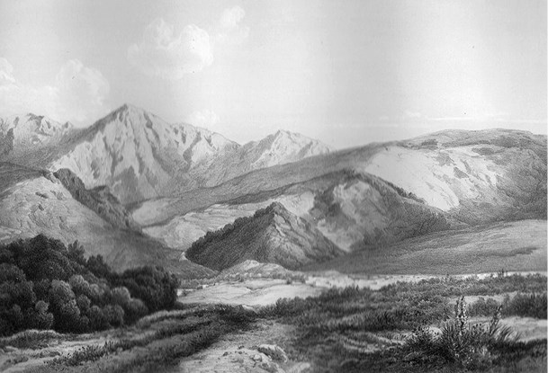 Рис. 19. Горы Аксай-тау, к югу от Самарканда (из альбома «Виды Русского Туркестана по рисункам с натуры Ольги Александровны Федченко»)