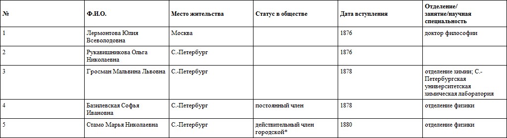 Русское химическое (впоследствии Русское физико-химическое) общество за 70-е годы приняло в свои члены пять женщин (таблица 6)964964