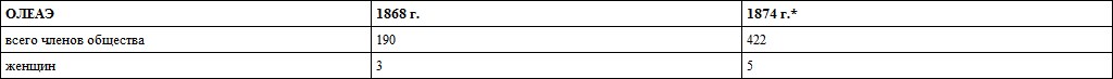После 1874 года Общество любителей естествознания, антропологии и этнографии не публиковало списков своих членов. Сведений об этом среди сохранившихся архивных документов ОЛЕАЭ также не обнаружено. Но просмотр протоколов заседаний общества не выявляет активного участия женщин в его работе в 80–90-е годы XIX века за исключением деятельности О. А. Федченко.