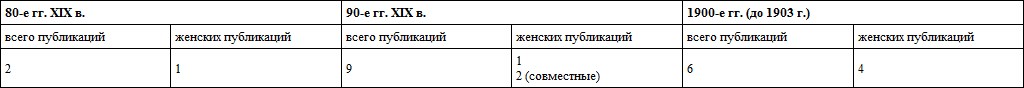Например, результаты работ, проводившихся в химической лаборатории С.‐Петербургских Высших женских курсов в период с 1884 по 1903 год, нашли отражение в 17 публикациях. Из них только 7 подписаны женщинами и 2 – совместные. (Распределение публикаций по годам, см. в таблице 11).10191019