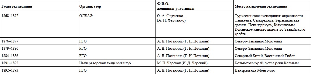 Таблица 13. Российские географические экспедиции, значительный научный вклад в достижение результатов которых внесли женщины (вторая половина XIX – начало ХХ в.)