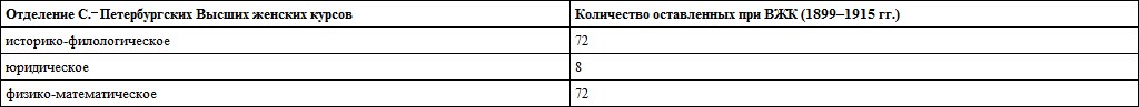 В 1900-е годы практика оставления при С.‐Петербургских Высших женских курсах для продолжения научной подготовки вполне сложилась, несмотря на отсутствие перспективных рабочих мест для будущих выпускниц, получивших эту дополнительную подготовку. Курсы даже имели возможность командировать отдельных слушательниц за границу для занятий в европейских университетах, естественнонаучных музеях и прочее. В изученных нами «Списках оставленных при курсах» имеется упоминание о 14 заграничных командировках, но эти данные могут быть не вполне полными11761176