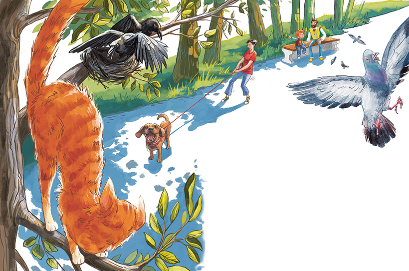 – Дядя Кузя, привет! У нас во дворе сегодня такое случилось! Кот охотился на голубей, и сам чуть не попался – за ним погналась соседская собака! Кот забрался на дерево, думал переждать в безопасности. Но не тут-то было! На ветках вороны устроили свои гнёзда и кинулись с боем их защищать. Вот бедняге и пришлось удирать обратно, на землю. Ещё повезло, что хозяйка увела свою собаку.