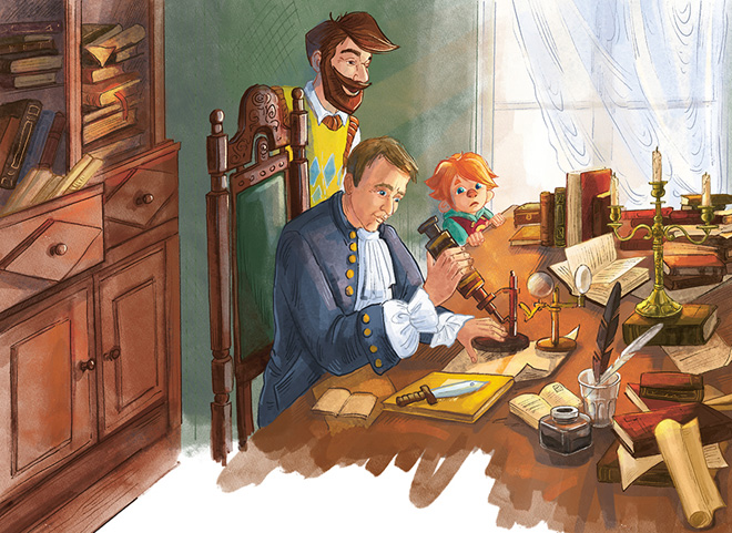 – Да, Чевостик. У Гука был один из первых микроскопов. Тогда в них было всего две линзы. Одна находилась в окуляре – части прибора, куда смотрел наблюдатель, а вторая на другом конце трубки, ближе к предмету, который рассматривали. Такие микроскопы давали довольно расплывчатое изображение. Но Гук сумел добиться большей чёткости, вставив в трубку ещё одну линзу. Она была крохотной, однако позволяла сильнее увеличить изображение предмета и лучше его рассмотреть.