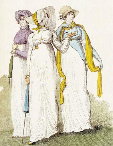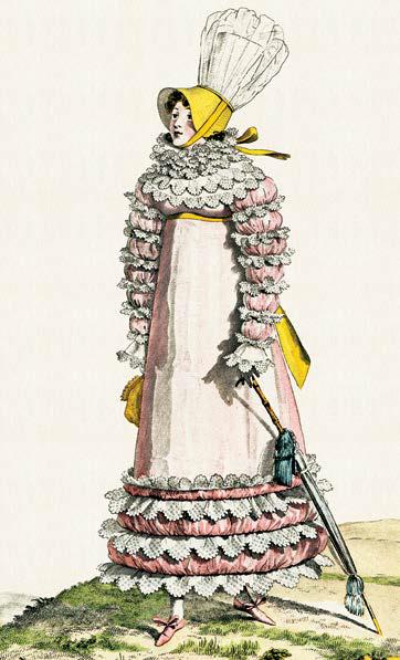 Хотя высокая талия все еще сохранялась, примерно в 1805 году появился новый стиль. Со шлейфом было покончено, платье все еще было облегающим, а вот длина платья варьировалась: закругленный низ то оставлял ступни открытыми (1808), то доходил до лодыжек (1811). Платье стало короче снизу, руки и плечи закрыты, вокруг шеи – пышная оборка. Неземные нимфы и богини исчезли, уступив место гротескно одетым фигурам, больше похожим на мандрагоры, чем на людей. Этот безвкусный стиль достиг своего расцвета в Вене в 1817 году, когда платье, полностью лишенное лифа, больше напоминало балахон, внизу которого, на уровне щиколоток, был вырез, позволявший видеть кружева нижней юбки. К этому добавлялся прежний вид шляпы – и пугало готово.