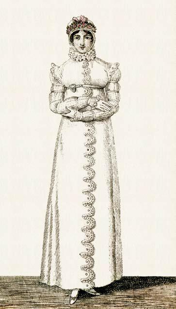 Лиф, если его можно так назвать, по-прежнему сохранял низкий вырез и короткие рукава. «Романтический» стиль, однако, внес свои изменения: рукава стали пышными, а высокая кружевная оборка окружала шею. Подобные реминисценции средневековой моды встречались в Берлине еще в 1793 году, когда актриса Унзельманн ввела моду на рыцарские воротнички, и снова в 1796-м, когда берлинские дамы одевались а-ля Джейн Грей[51]51