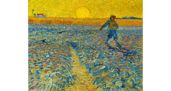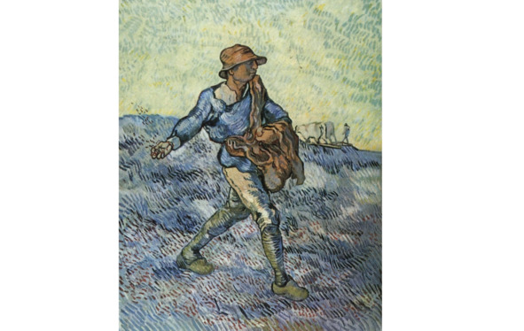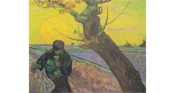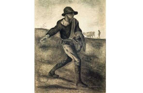 Это период «Едоков картофеля». Еще он сделал очень интересный подготовительный рисунок для картины, которая называется «Сеятель», где изобразил идущего крестьянина, с привязанным к нему лукошком и сеющего злаки. Он бросает в землю зерно и оплодотворяет землю зерном. И какого интересного сеятеля он пишет в 90-м году! Посмотрите и сравните эти две картины, и вы увидите путь, который прошел Ван Гог, не только, как художник, не только, как живописец, а как Ван Гог -мыслитель, Ван Гог – повествователь, Ван Гог– рассказчик. Потому что того сеятеля, почти не имеющего лица, которого Ван Гог пишет в 90-м году, он изображает, как какого-то мифологического оплодотворителя планеты. Посмотрите на его фигуру, находящуюся под восходящим раскаленным светилом, сжигающим землю. Что-то еще есть в этом. Какая-то апокалиптическая безнадежность.