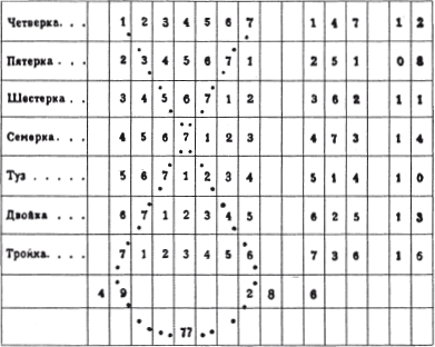 Следовательно оказывалось, что А=26, Б=0, В=17, Г=0, Д=11, Е=24, но эти последние не были разъясняемы. Надо заметить, что при каждой операции надлежит всегда тщательно перетасовывать карты и давать их снимать (срезывать) гадающему.