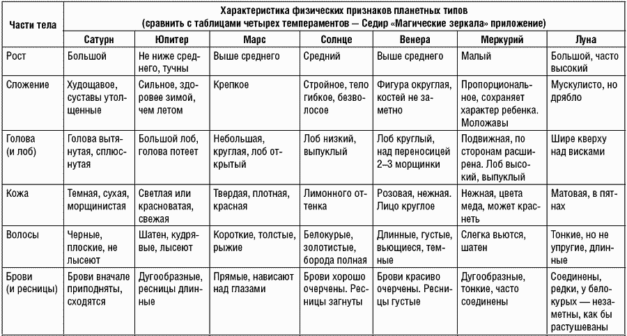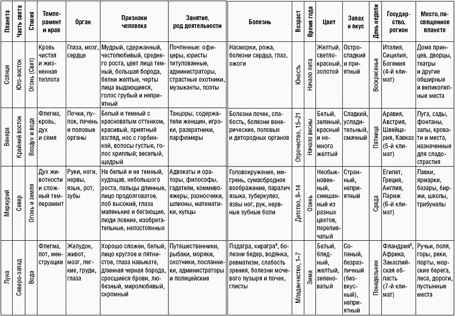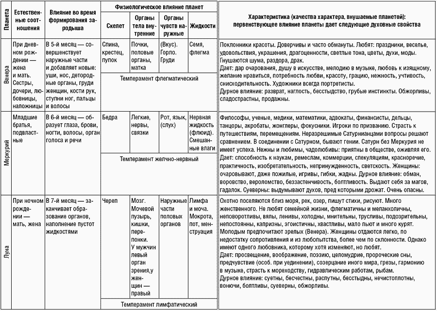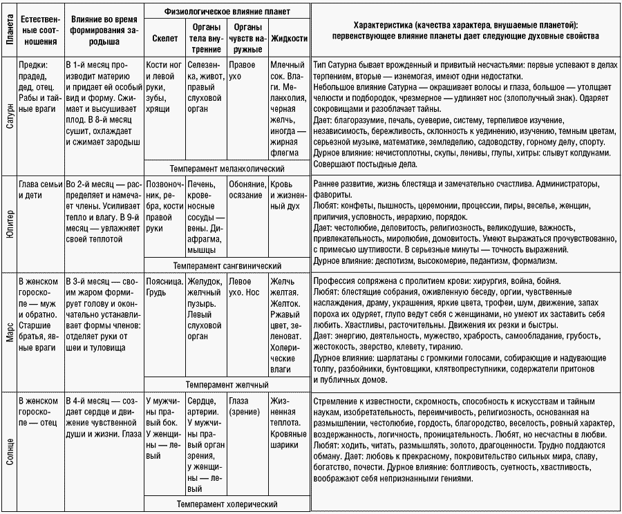 Первая таблица влияния планет