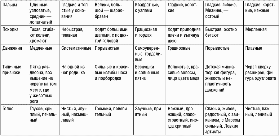При применении каждая из общих рубрик разделяется на три группы, в соответствии с их естественными признаками, которые мы должны уметь распознавать. Самый быстрый и практичный путь для этого, по нашему мнению – изучение лица, особенно формы носа, и почерка, если его удастся достать. Имея в качестве основного белый цвет для сравнения с ним руки или, например, сравнив лист подсиненной белой бумаги с розоватым оттенком скул, или желтоватое, как старая слоновая кость, лицо на чисто белом фоне и при этом чрезвычайно энергичный взгляд в сочетании с темным цветом глаз – мы увидим, что перед нами индивидуум с исключительной силой воли. Следующие четыре таблицы, относящиеся к четырем основным сущностям: инстинктивной, анимической, интеллектуальной и волевой – вполне достаточны для практикующего мага, чтобы он, при определенном навыке, мог распознавать людей, с которыми имеет дело. Это будет означать выполнение первой части служения обществу – диагностики.
