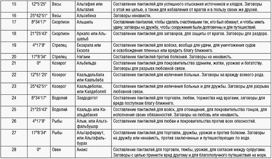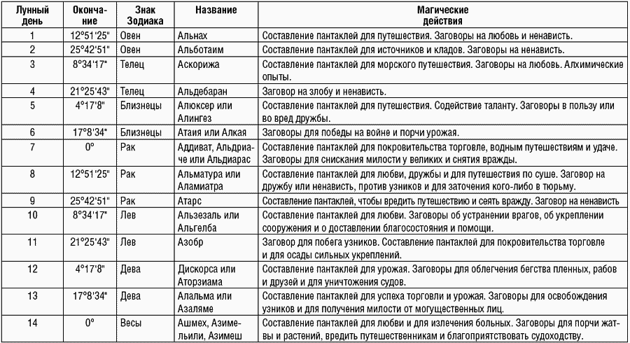 Таблица магических действий, предписанных на каждый лунный день