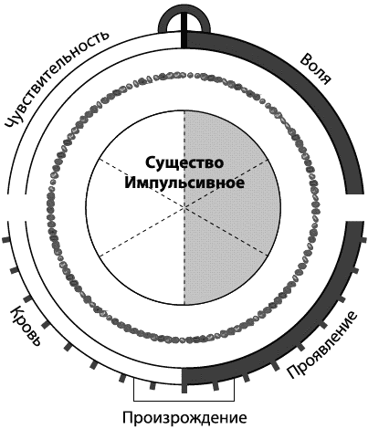 Отсюда следует, что импульсивное существо, во всех своих трех проявлениях, находится между физическим телом и духом. И оно одинаково повинуется импульсам, исходящим как от одного, так и от другого, при этом выбирая сильнейший. Именно поэтому человек, постепенно перестающий воздействовать волей на импульсивные центры, тем самым приучает их полностью подчиняться внешним побуждениям и быстро становится рабом своего физического тела, вместо того чтобы быть его господином.