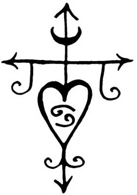 Центральная фигура – Донна, поэтому я хочу сначала нарисовать символ, обозначающий ее. Я хочу, чтобы она чувствовала себя защищенной и сосредоточилась на выздоровлении, находясь в безопасном месте, поэтому нарисую рядом с ее символом сердце со спиралями, исходящими из его нижней части. Затем мне нужно изобразить «справедливость» и «безопасность», поэтому я добавляю знак «плюс», выходящий из верхней части сердца, и пририсовываю весы к любой другой его части. Верхняя часть знака «плюс» кажется мне пустой, поэтому я размещаю сверху рогатый полумесяц. Остается обозначить «скорость», и я рисую стрелки, указывающие все четыре стороны света. Вуаля! Сигил готов!