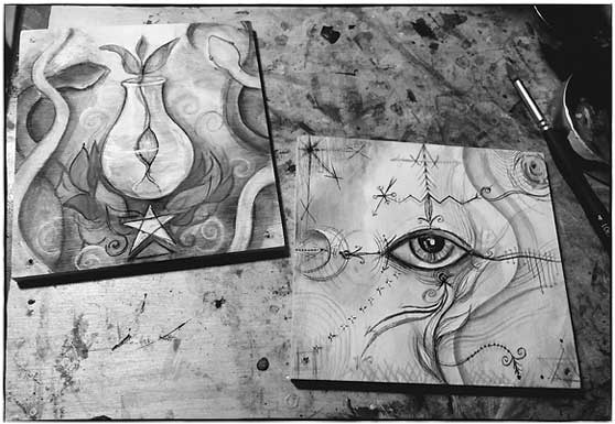 Я часто использую сигилы как часть своих произведений изобразительного искусства, однако картина может состоять из сигила целиком. Если хочется сделать что-то прочное, долговечное, что можно повесить на стену, ищите для своих картин холсты в специальных подрамниках. Если вы предпочитаете рисунки большого размера (более нескольких дюймов), не покупайте полотна на деревянной основе, так как со временем они деформируются. Лично мне безразлично, какой текстуры взять холст, поэтому я как раз предпочитаю такие полотна. Однако чаще я просто исхожу из возможностей бюджета. Холсты и полотна бывают самых разных размеров и форм, поэтому выбирайте такой, который будет максимально соответствовать идее вашего сигила. Из красок я предпочитаю акриловую Delta Ceramcoat. Она недорогая (меньше двух долларов за бутылку), ею легко работать (не такая густая, как большинство акриловых красок), ее можно купить практически в любом магазине. Кисти мне нравятся с короткой ручкой с мягкой синтетической щетиной, подобные серии University от Winsor & Newton. Они экономичные и долговечные, если правильно их очищать после использования (в следующей главе вы найдете больше рекомендаций по выбору принадлежностей для рисования).