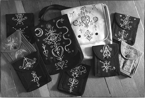 Холщовые сумки и кошельки автора с сигилами, нанесенными смывающейся краской