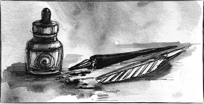 Для профессионалов: вы всегда можете прибегнуть к классике (что более экологично по сравнению с только что упомянутыми одноразовыми ручками), потратив чуть больше денег и купив специальный держатель, металлический наконечник-перо, баночку с чернилами или даже настоящее перо, если вы любитель экспериментов. Попробуйте различные виды сменных перьев: есть специальные для рисования и каллиграфии. Для работы пером определенно требуется немало практики. Однако даже при умелом использовании волокна бумаги могут цепляться за кончик пера и образовывать чернильные пятна. Я держу все имеющиеся у меня виды ручек довольно близко к основанию, поэтому руки у меня постоянно в чернилах, несмотря на все усилия. Если мне хочется чего-то более органического, вместо ручки или пера я беру тонкую кисть: так я чувствую, что лучше контролирую прохождение чернил сквозь щетинки. (См. раздел о кистях.)