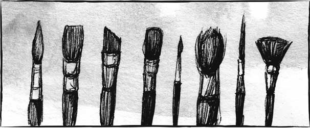 Хорошие кисти – это основная инвестиция художника. Перед ним стоит выбор из сотен вариантов, различающихся по форме, размеру и материалу. Начинающим рекомендую выбрать кисточку из синтетических волокон: на ощупь они гладкие и шелковистые. Я предпочитаю кисти с закругленными кончиками, в особенности кисти 233-й университетской серии от Winsor & Newton. Чем меньше размер (000, 00, 1, 2), тем тоньше кончик кисти, чем больше (3, 5, 8, 12, 14) – тем толще. Рассмотрите, как располагаются щетинки в кисти – каждый вид дает разное качество линии. Округлые, закругленные с острым кончиком, супертонкие для прорисовки контуров – такие кисти очень хороши для создания тонких четких линий. Плоские и широкие лучше подходят для крупных и смелых мазков и работы на больших поверхностях. Плоскоовальная форма кисти позволяет смешивать цвета. Плоская или скошенная плоская форма придаст штрихам отчасти каллиграфический эффект, поскольку с ее помощью вы можете получить как тонкие, изящные, так и широкие, размашистые линии.
