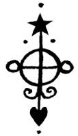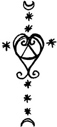 Начать рисунок сигила для Джеральдины я решила со щита, нарисовав большой круг с крестом в центре. Он символизирует двойной фокус внимания – на наблюдении за течением болезни и ее внутреннем состоянием. Я нарисовала по обе стороны большого круга два маленьких – отчасти как напоминание о груди, которой она пожертвовала во время операции, но больше как символ, олицетворяющий рождение чувственности внутри Джеральдины. Через центр круга я провела вертикальную линию, выходящую за его пределы сверху и снизу. Ее верхнюю оконечность я украсила вертикально направленной пентаграммой для обеспечения защиты и придания внутренней силы. На нижней оконечности линии я разместила небольшое сердце для уравновешивания и укрепления ее эмоционального состояния. Сердце состоит из пары зеркально расположенных спиральных линий, подобно цветку. Мне показалось, что этому сигилу нужно придать больше энергии, поэтому я добавила в него четыре точки – по одной на каждое десятилетие жизни. Общий эскиз сигила представляет собой олицетворение женского начала, полного сил и готового к борьбе.