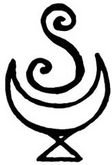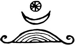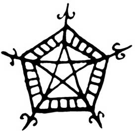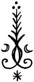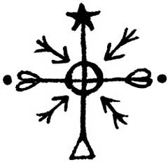 Поскольку Растущий полумесяц – это название ковена и сигил будет использоваться не только для направления его энергии на магические практики, но и как представляющий его символ, я решила начать рисунок с фигуры растущего полумесяца. Далее я добавила перевернутую звезду (овладение навыками) внутрь пирамиды (мудрость). Затем я подумала, что основание пирамиды может служить базовой линией, а также подставкой весов. Чтобы весы стали больше похожи сами на себя, я добавила еще два полумесяца и фигуры в форме листьев для обозначения роста. Мне показалось оправданным размещение третьего листа на нижней оконечности звезды/пирамиды, так как это уравновесило рисунок. Чтобы соединить большой полумесяц со звездой, пирамидой, весами и добавить идею поиска себя, я нарисовала направленную вверх стрелку, исходящую из основания звезды и проходящую сквозь него. Общая картина рисунка вызывает у меня ассоциацию с флюгером, который может изменять направление в зависимости от обстоятельств, сохраняя при этом собственное равновесие. Это очень важная характеристика проводящего совместную работу коллектива.