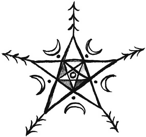 Самая крупная часть рисунка – пятиконечная звезда, символизирующая защиту и образующая все сущие стихии: землю, воздух, огонь, воду и дух. Внутри этой звезды находится вторая звезда, еще один слой защиты и уравновешивания конфликтных ситуаций, проливающий свет на тьму и неизвестность. Внутри этой звезды открытый круг символизирует яйцо, семя истины, око внутреннего спокойствия, потенциал. Из каждого луча большой звезды исходят стрелки с тройными наконечниками. Они направляют нашу энергию вовне, одновременно защищая и глубоко вонзаясь в пораженную цель. Внутри образованных большой звездой шевронов есть полумесяцы, чьи рога защищают уязвимые сферы, символизируют рост и убывание луны, идей, волн. На каждый из следующих четырех лет приходится одна луна, а пятая служит для ознаменования начала новой эры надежды и перемен. За каждым полумесяцем расположена черная точка – пункт отправления или назначения, энергия новолуния, изгоняющая страхи и тьму изнутри и снаружи.