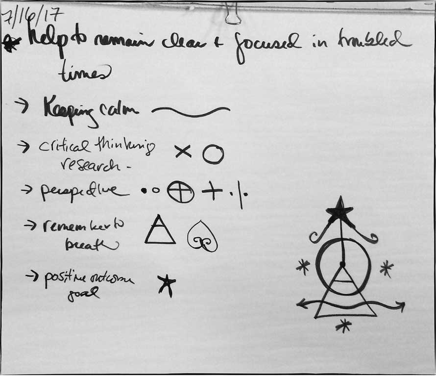 Сегодня многое поставлено на карту, мы сильно рискуем, над нами нависла большая угроза, но это именно то время, для которого мы рождены. Я хочу, чтобы слезы страха и опасений сменились слезами решимости, рожденными ветрами революции. Я коснулась кистью листа бумаги с намерением создать сигил для всех, кто нуждается в защите и покровительстве от надвигающейся бури. Чтобы призвать его силу и напомнить людям о них самих. Чтобы мой сигил стал маяком и привел нас к эпохе Звезды, благополучно проведя через эпоху Башни.