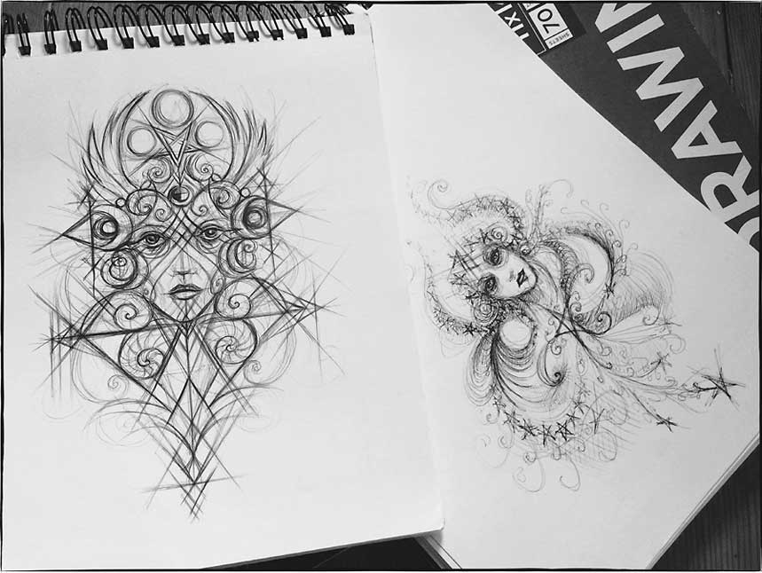 Подруга уговорила меня провести продажи на мероприятии, чтобы поддержать ее компанию. Мне было некомфортно там, в торговом зале время тянулось очень медленно. Я установила мольберт, почти скрытый за монитором, и открыла большой блокнот. Взяла карандаш и начала смешивать естественные и геометрические формы в виде фигуры богини. Через пару часов карандашный набросок был закончен. В процессе работы я выкладывала фотографии рисунка в интернет и была поражена ответной реакцией. На следующий день я написала ее тушью (ничего не испортив!).