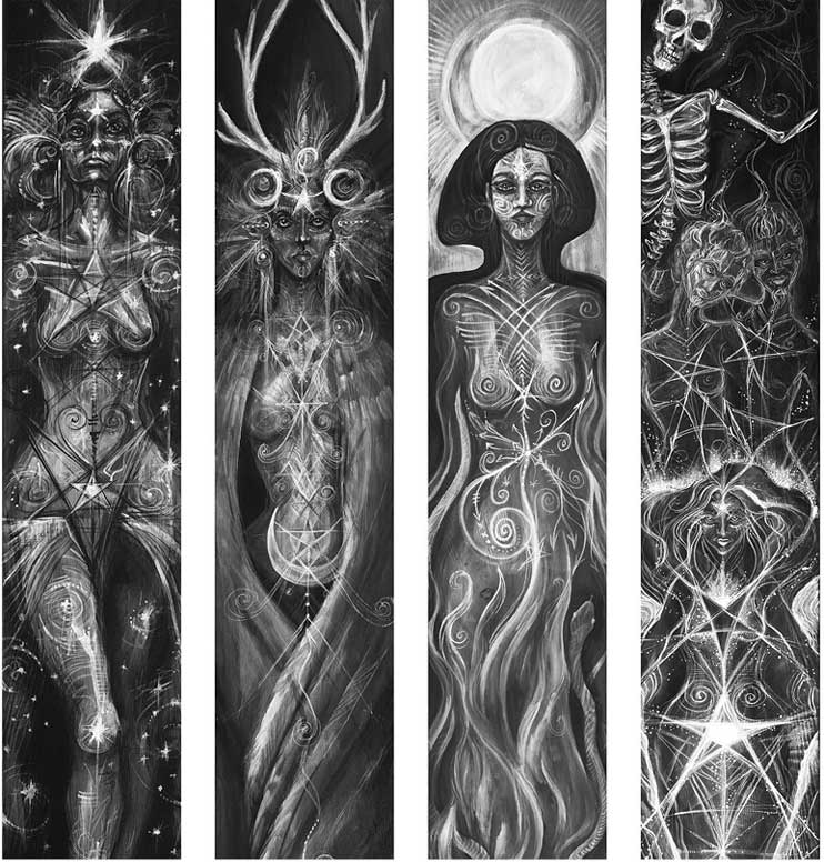 Фрагменты картин из серии Iconomage: Звездная богиня • Охотница • Геката • Когда любовь возлегла со смертью и тьмой, родился свет