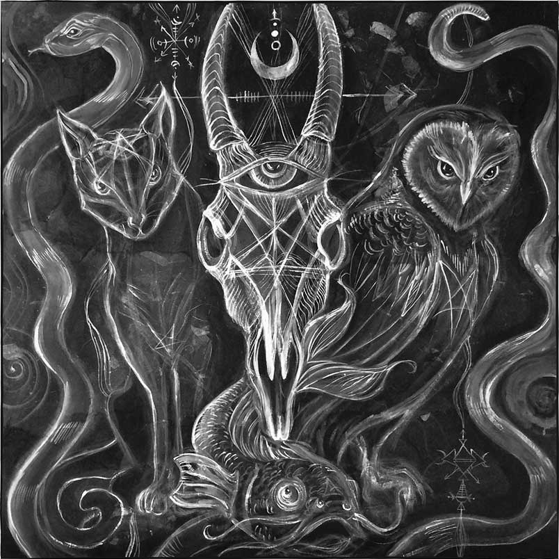 Территория фамильяра – комбинированная картина на березовой панели размером 60 × 60 см, она участвовала в моей персональной выставке «Сердце ведьмы» в 2016 году. В ней рассматриваются элементарные энергии животных/духов-спутников. (Оригинал находится в частной коллекции. Доступны небольшие принты.)