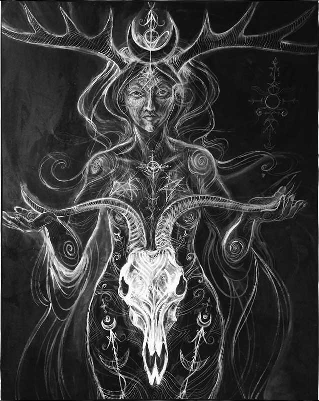 Королева Шаббата – комбинированная картина на восстановленном холсте размером 80 × 100 см. На эту картину меня вдохновило создание сигилов для моих ног. (Оригинал в настоящее время находится в коллекции художника. Доступны небольшие принты.)