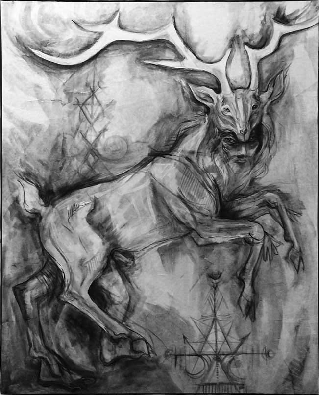 Шаман – комбинированная картина на восстановленном холсте размером 80 × 100 см. Этот мотив я повторяю с девяностых годов, когда впервые наткнулась на рисунки, основанные на «Колдуне» – изображении, найденном в пещере Труа-Фрер в Арьеже (Франция) и сделанном около 13 тысяч лет до н. э. (Оригинальная картина в настоящее время находится в коллекции художника. Доступны мелкие принты.)