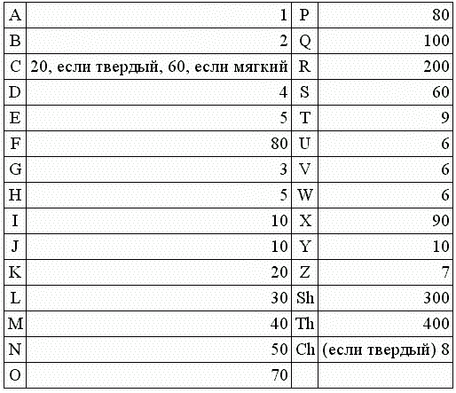 У еврейского и греческого алфавитов есть общая черта: оба они в свое время использовались для написания цифр. Числовые значения их букв, соответственно, были закреплены традицией до появления практик гематрии и изопсефии. Однако английский алфавит сформировался уже после широкого распространения альтернативных способов обозначения чисел, из которых наиболее известным и удобным стали так называемые арабские цифры: 1, 2, 3, 4, 5, 6, 7, 8, 9 и 0. Следовательно, чтобы определить числовые значения букв английского алфавита, нужно «назначить» их каким-то не совсем произвольным образом. Было разработано немало методов. Кто-то просто брал фонетические корреляты букв иврита и их значения.