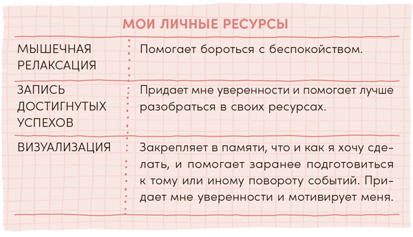 Пока вы читаете книгу и работаете с ней, составьте также свой список личных ресурсов. Краткое изложение того, что оказалось для вас полезным, даст вам возможность в минуты слабости или сомнений выбрать тот или иной инструмент. Вы также будете осознавать, чему научились.