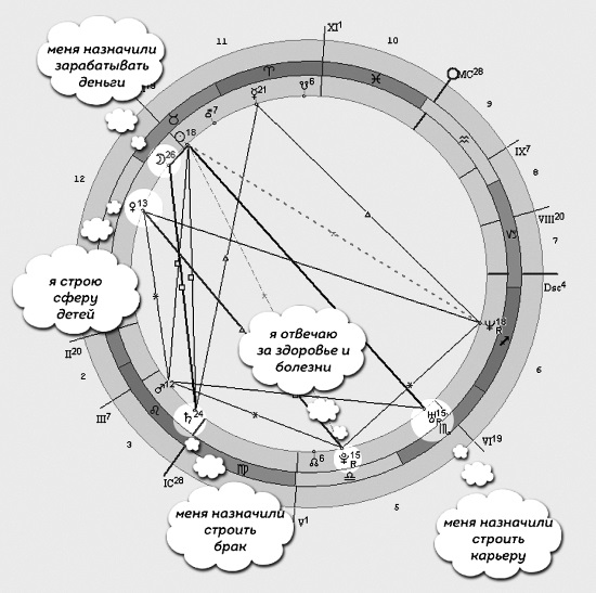 • импульс из одной сферы детонирует цепную реакцию по другим сферам – как детский паровозик, который колесит по замкнутой железнодорожной трассе («стало меньше денег – значит появилась угроза развода – значит скоро испортится здоровье»; «дали новую должность – значит появятся новые друзья – значит произойдет новое любовное знакомство»; таких сценариев карта может насчитывать десятки, главное – найти корешок, с чего начинается вся свистопляска, и уметь идентифицировать его в прогнозе);