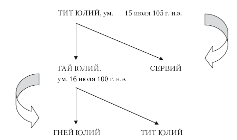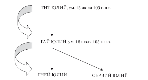 15 июля умирает Тит Юлий. Его единственный наследник – Гай Юлий умирает на следующий день, не успев вступить в наследство, но становясь наследодателем уже для своих потомков – Гнея и Сервия. Гней и Сервий, вступая в наследование имуществом Гая Юлия, автоматически приобретают и имущество, которое осталось от Тита Юлия.