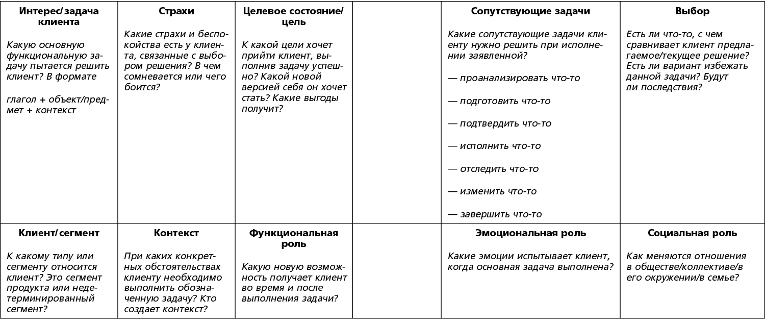 Канва фокусируется на образе контекстуального (поведенческого) портрета клиента. Ведь именно на пользователе сосредоточен подход JTBD и именно понимание проблем и целей клиента помогает лучше всего осознать, что необходимо реализовать в продукте. Имейте в виду: это не «прямые хотелки», а целевые состояния, к которым приведет клиента ваш продукт.