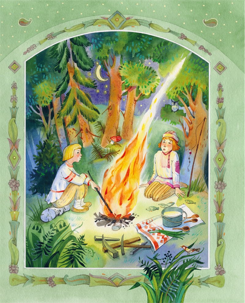 И вот ушёл старик в лес, а ребята остались. Друг на друга поглядывают и ничего не говорят. Потом старший насмелился и говорит тихонько: