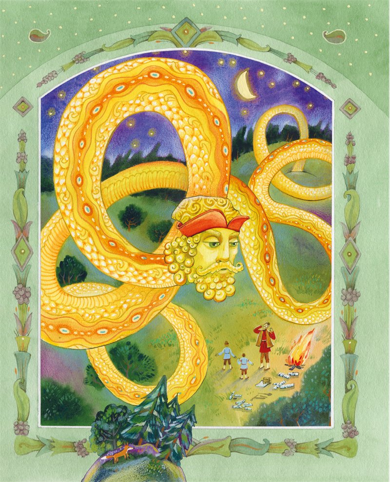 И вот из-под земли стало выкатываться тулово преогромного змея. Голова поднялась выше леса. Потом тулово выгнулось прямо на костёр, вытянулось по земле, и поползло это чудо к Рябиновке, а из земли всё кольца выходят да выходят. Ровно им и конца нет. И то диво, костёр-то потух, а на полянке светло стало. Только свет не такой, как от солнышка, а какой-то другой, и холодом потянуло. Дошёл змей до Рябиновки и полез в воду, а вода сразу и замёрзла по ту и по другую сторону. Змей перешёл на другой берег, дотянулся до старой берёзы, которая тут стояла, и кричит: