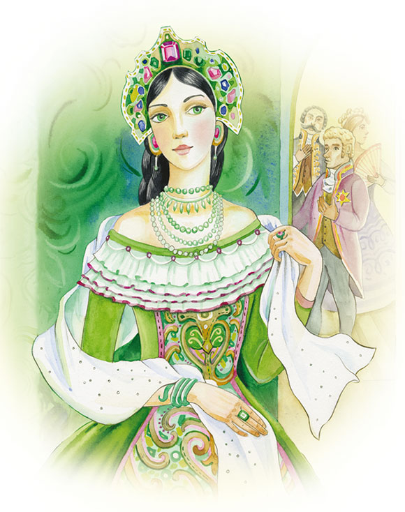 Повернулась Танюшка – перед ней помещение, какого она отродясь не видывала. Не то церква, не то что. Потолки высоченные на столбах из чистого малахиту. Стены тоже в рост человека малахитом выложены, а по верхнему карнизу малахитовый узор прошёл. Прямо перед Танюшкой, как вот в зеркале, стоит красавица, про каких только в сказках сказывают. Волосы, как ночь, а глаза зелёные. И вся-то она изукрашена дорогими каменьями, а платье на ней из зелёного бархату с переливом. И так это платье сшито, как вот у цариц на картинках. На чём только держится. Со стыда бы наши заводские сгорели на людях такое надеть, а эта зеленоглазая стоит себе спокойнешенько, будто так и надо. Народу в том помещенье полно. По-господски одеты, и все в золоте да заслугах. У кого спереду навешано, у кого сзади нашито, а у кого и со всех сторон. Видать, самое вышнее начальство. И бабы ихние тут же. Тоже голоруки, гологруды, каменьями увешаны. Только где им до зеленоглазой! Ни одна в подмётки не годится.