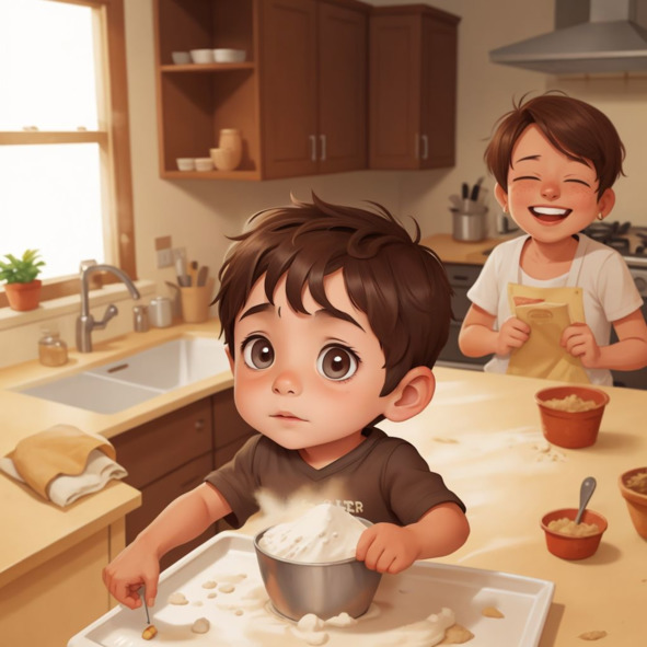 Теперь пришло время добавлять муку. Джулиан попытался всыпать ее медленно. Но упс! Мука рассыпалась по всему столу. Джулиан посмотрел на маму большими глазами. Она рассмеялась и сказала: «Все в порядке, Джулиан. Ошибки случаются!» Они вместе убрали муку. Затем они добавили оставшуюся муку в миску.