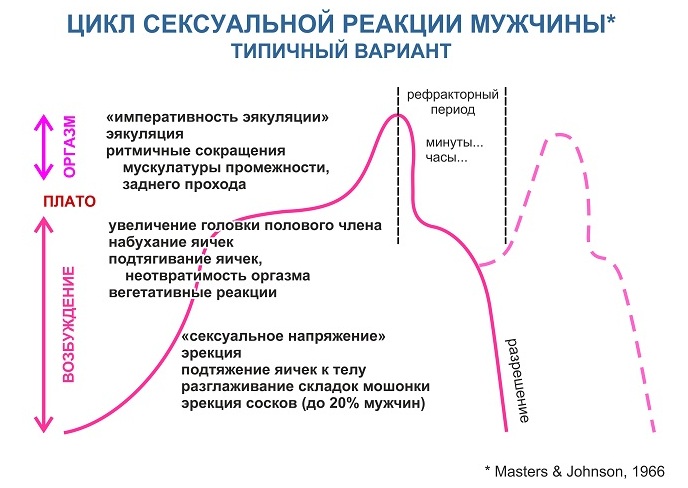 Для наглядности рассмотрите эти две схемы на основе исследований 1966 года, которые покажут, как по-разному происходит возбуждение, оргазм и спад возбуждения у мужчин и женщин.