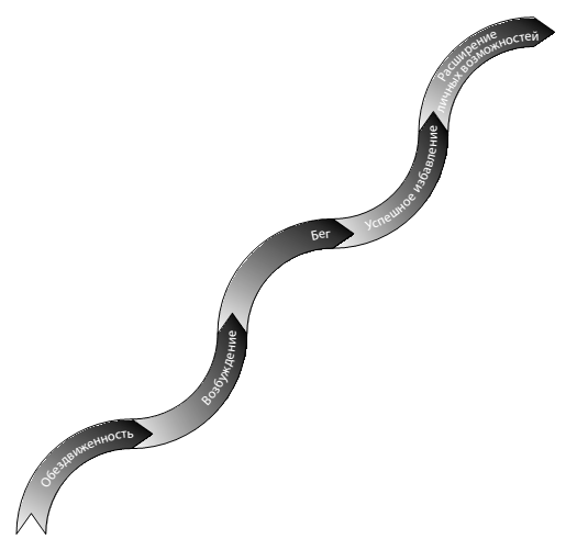 Рис. 2.1b. Мне удалось вывести Нэнси из состояния неподвижности/страха и гипервозбуждения, позволив ей воссоздать опыт бегства и успешного избавления от потенциальных агрессоров. Для клиентки было важно ощутить переживание бега. Без его внутреннего восприятия этот опыт имеет лишь ограниченную ценность.