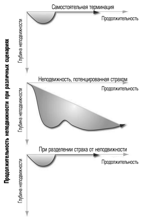 Рис. 4.1a. Этот рисунок иллюстрирует продолжительность и тяжесть «оцепенения» в трех ситуациях. Первый сценарий соответствует нападению на опоссума, который при этом притворяется мертвым. Жертва замирает, и хищник, теряя интерес к инертной падали, уходит в поисках живой добычи. Оставшись один, опоссум «стряхивает» с себя эту встречу и продолжает путь, состояние при этом ничуть не ухудшается. Это называется «самостоятельной терминацией неподвижности». Второй сценарий иллюстрирует, что происходит, когда животное, выходящее из неподвижности, удерживают и пугают. Оно снова погружается в состояние ужаса, неподвижность становится гораздо глубже и длится гораздо дольше. Этот парализующий ужас – следствие потенцированной страхом неподвижности – приводит к посттравматическому стрессовому расстройству. Вот почему фраза «время лечит все раны» совершенно неприменима к травме. Третий сценарий показывает, что происходит во время успешного сеанса терапии. Психотерапевт постепенно направляет клиента к кратковременному соприкосновению с ощущением неподвижности, а затем направляет его к тому, чтобы рассоединить страх и неподвижность. Это позволяет клиенту избавиться от гипервозбуждения, лежащего в основе реакций, и вернуться к состоянию равновесия.