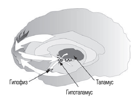 Рис. 4.2. Этот рисунок иллюстрирует важность поддержания в онлайн-режиме префронтальной коры во время активации в стволе головного мозга и лимбической системе возбуждения, обусловленного необходимостью выживания. Обратите внимание, как передаются нервные импульсы между структурами мозга, ответственными за инстинкты, – таламусом и гипоталамусом (контролирует секрецию гипофиза, жизнен-но важную для поддержания гомеостаза органов и клеток), – и лобной долей (или рациональным мозгом).