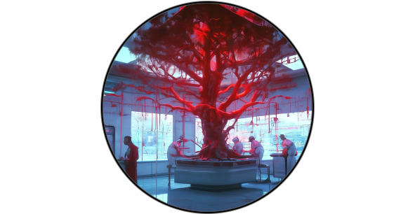Новая картинка – белая комната в центре которой растёт красное, словно состоящее из крови, дерево, корни вросли в пол, ветки пульсируют, как живые, люди в белых халатах наблюдают и записывают что-то в железные блокноты. Лица ненастоящие и не выражающие никаких эмоций, движения дерганные, не живые. «Да это же роботы».