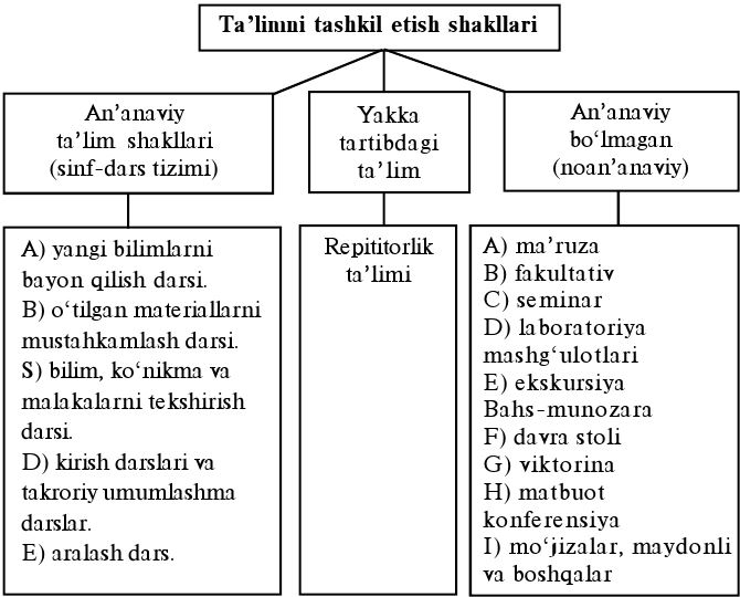 Ta’lim shakli, ta’lim jarayonini tashkil etish shakllari, an’anaviy darslar, noan’anaviy darslar, sinf, dars, ta’lim metodlari, ta’lim vositalari.