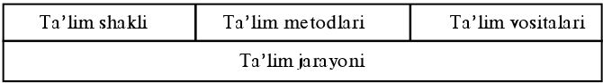 2. Ta’lim jarayoni samarasini ta’minlash unda ta’lim metodlaridan o‘rinli va unumli foydalanishga bog‘liq. Ta’lim metodi ta’lim jarayonida o‘qituvchi va o‘quvchilarning aniq maqsadga erishishga qaratilgan birgalikdagi faoliyatlarining usullari hisoblanadi. Ta’lim vositalari ta’lim metodlarining ta’limiy ta’sirchanligini oshirishga xizmat qiladi.