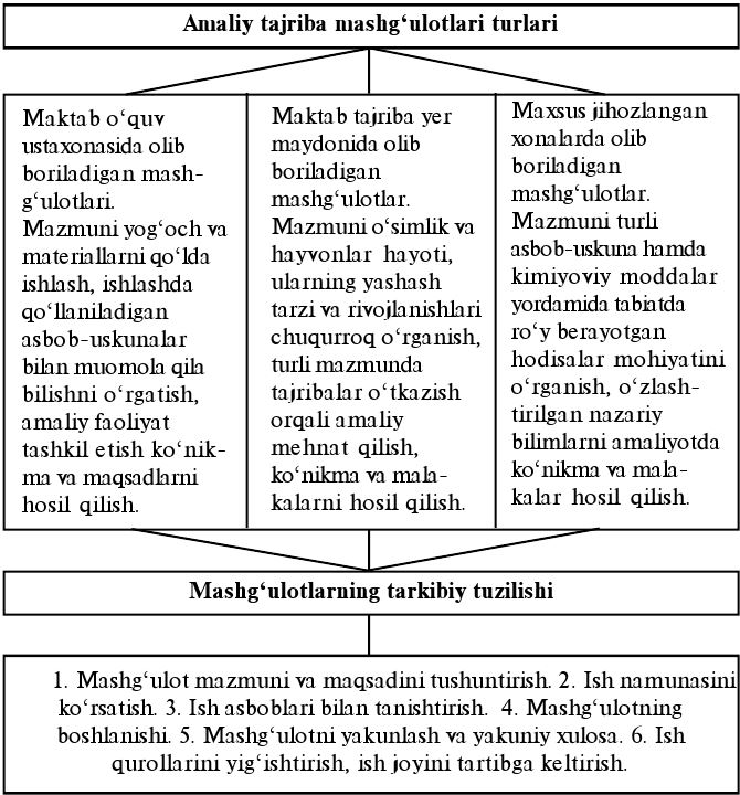 Umumiy o‘rta ta’lim maktablarining V—IX sinflarida olib boriladigan amaliy-tajriba mashg‘ulotlari asosan maktab ustaxonasi, maxsus jihozlangan xonalar va o‘quv tajriba yer maydonida olib boriladi.