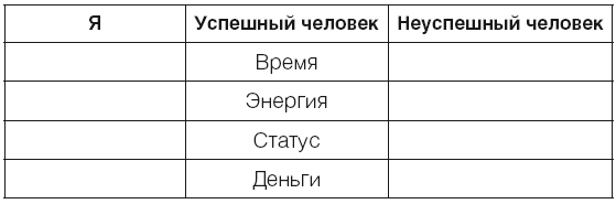Теперь еще одно задание, которое вам предлагаю выполнить: заполнить таблицу, расположив в ней следующие ценности (время, деньги, статус, энергия) в порядке убывания их значимости. (Попробуйте написать эссе по итогам вашей таблицы, это многое расскажет вам о вас.) И давайте сравним то, как вы заполнили таблицу, с тем, как это сделал бы некий «идеально успешный» человек (введем такой термин). И узнаем, как выглядит система ценностей в его глазах.