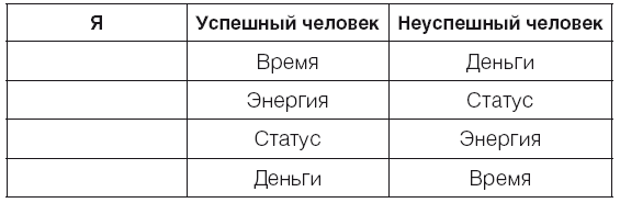 Первое. Давайте примем, что время и энергия, раз они занимают для успешного человека первые две строки, – это ценности первого, высшего порядка. А статус и деньги – второго порядка, они находятся ниже. Как вы понимаете, у неуспешного человека ценности второго порядка находятся выше ценностей первого. Моя задача – предложить вам несколько ключевых идей, несколько информационных конструктов, которые далее развернутся в стратегии, которые, в свою очередь, приведут вас к принципиально важным результатам. Напомню, что стратегия – это совокупность принятых решений, совершенных поступков при продвижении к поставленной цели.